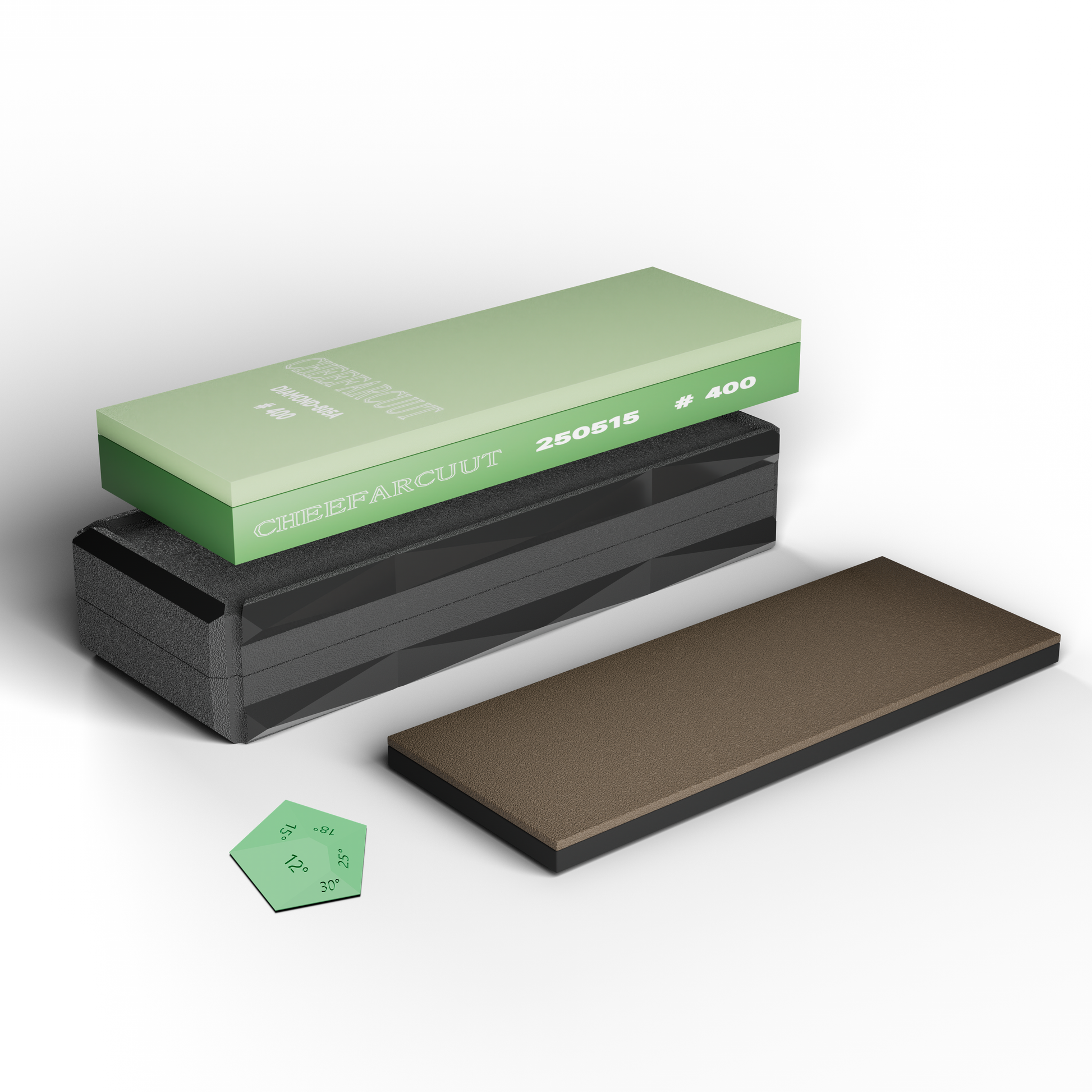 No—#400 is the right starting grit for dull edges, setting a new bevel, and fixing small chips. For a finer bite, follow with #1000 and then the included leather strop.